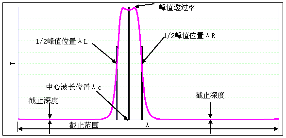 窄带滤光片的中心波长一般就是仪器或设备的工作波长,它是指通带中心位置的波长。图1为窄带滤光片的透过率曲线示意图。在图中,中心波长